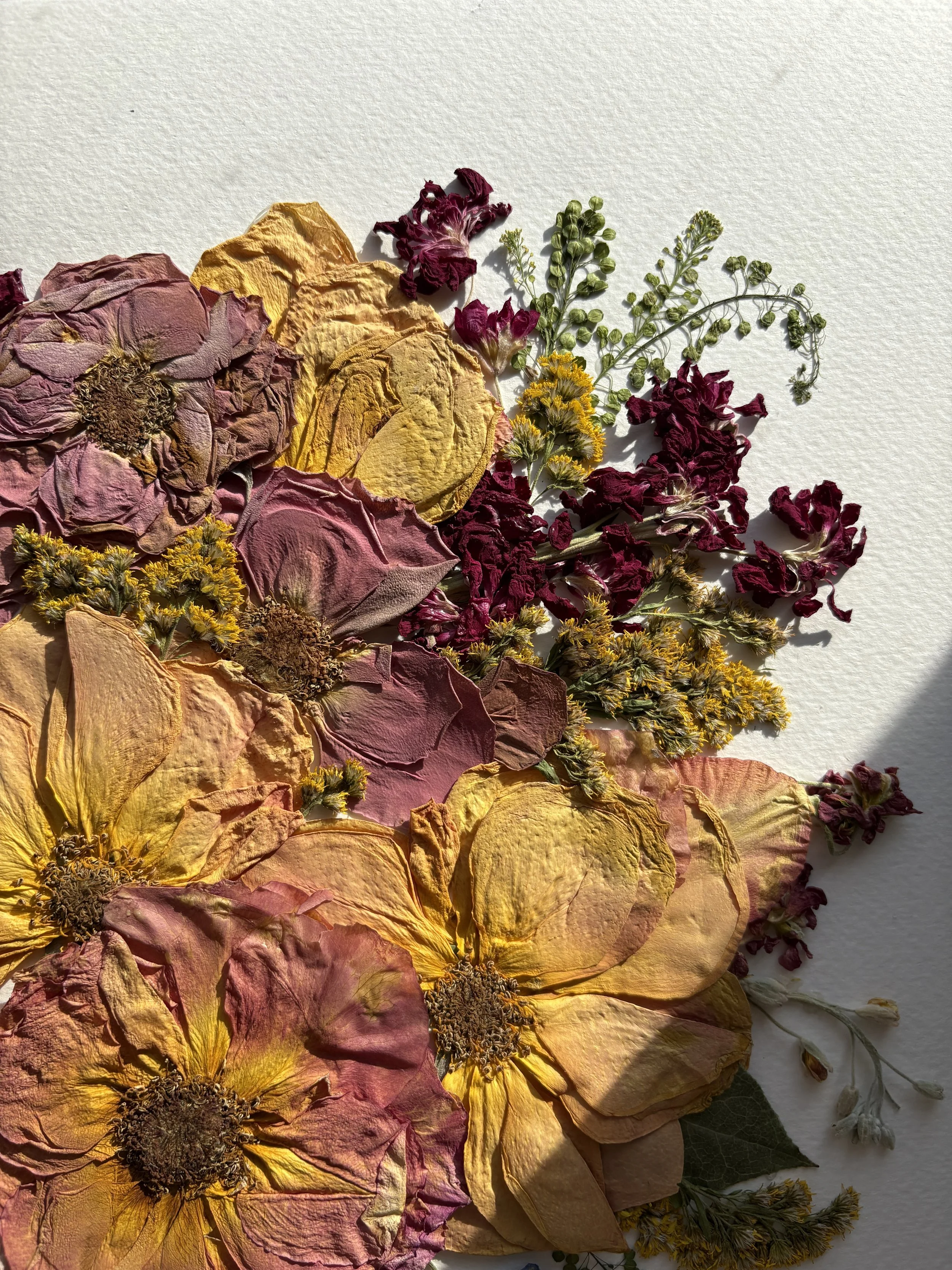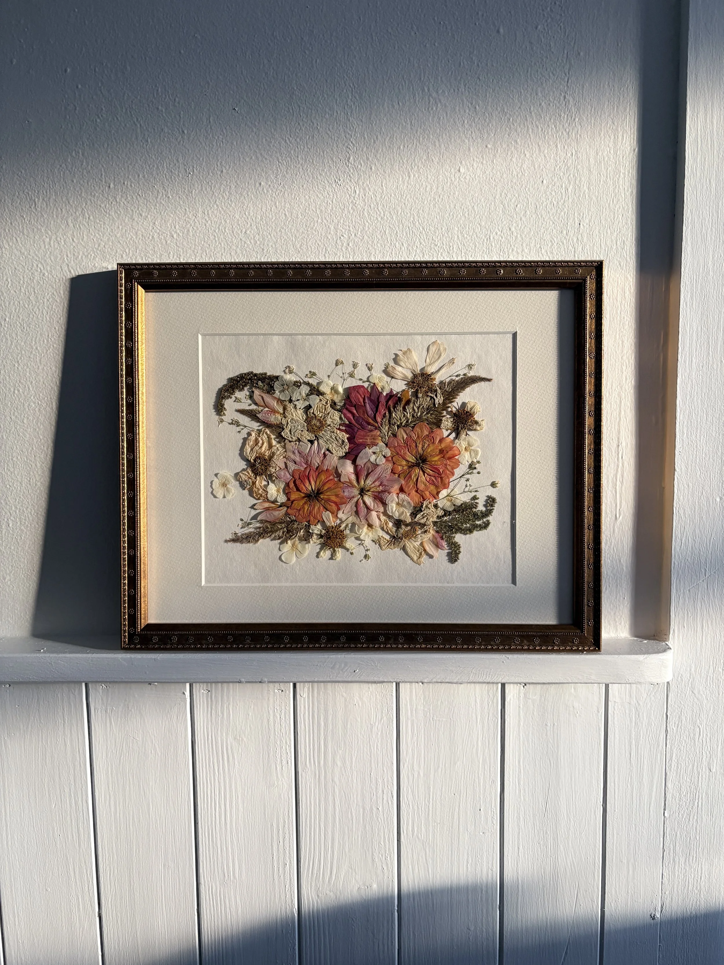 I use a traditional method of pressing flowers, which means your bouquet will dry over the course of 4 - 8 weeks. During this time, I check on your flowers and change the paper in the press so they dry as beautifully as possible. This method tends to give pressed flowers a more vintage feel in comparison to modern methods like using a microwave to press flowers. I do not color correct dried flowers, as I like the way the colors of flowers look as they dry! Because your wedding day is a memory that will last forever, I hope to create a timeless piece of art for you to remember it by. I have carefully chosen frames to choose from which I feel would compliment my personal floral arrangement style.